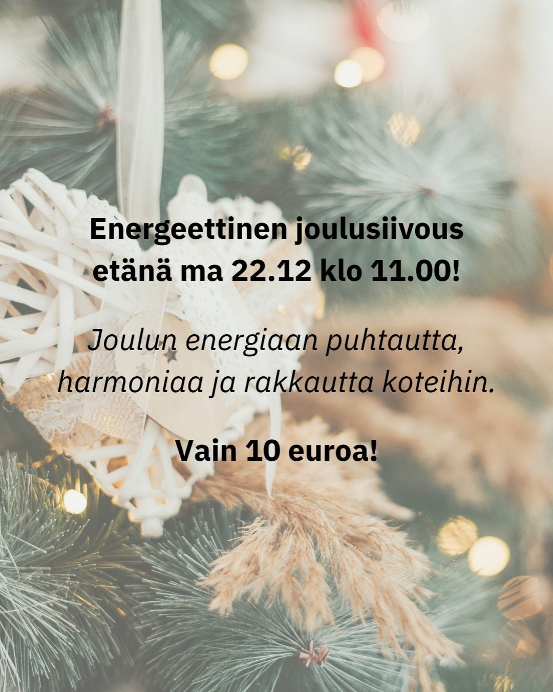 Samaan tapaan kuin pölypallerot kulkeutuvat nurkkiin ja kodeissa tulee tehdä säännöllisesti perussiivousta, on merkityksellistä siivota myös kodin energioita. Ja kuten suursiivouskin on toisinaan tarpeen, on joskus hyvä tehdä energioidenkin suursiivous! Jos en jouluksi jaksa mitään siivota, tekisin kuitenkin tämän! Ja siksi haluan mahdollistaa näin joulun alla koteihin puhtaammat ja raikkaammat energiat, jossasaatte nauttia joulunajan rakkaudesta, toivoen myös levätä ja palautua!